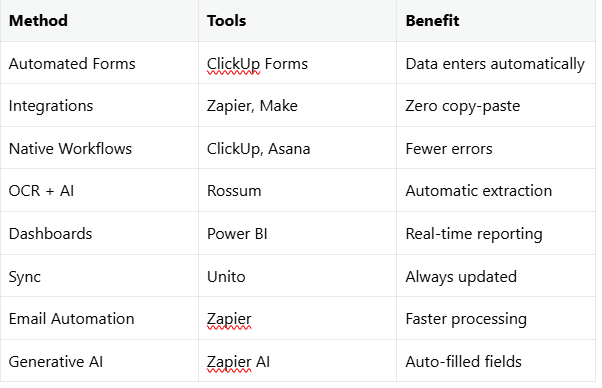 Tools like Typeform, Google Forms, and ClickUp Forms allow submissions to flow directly into: